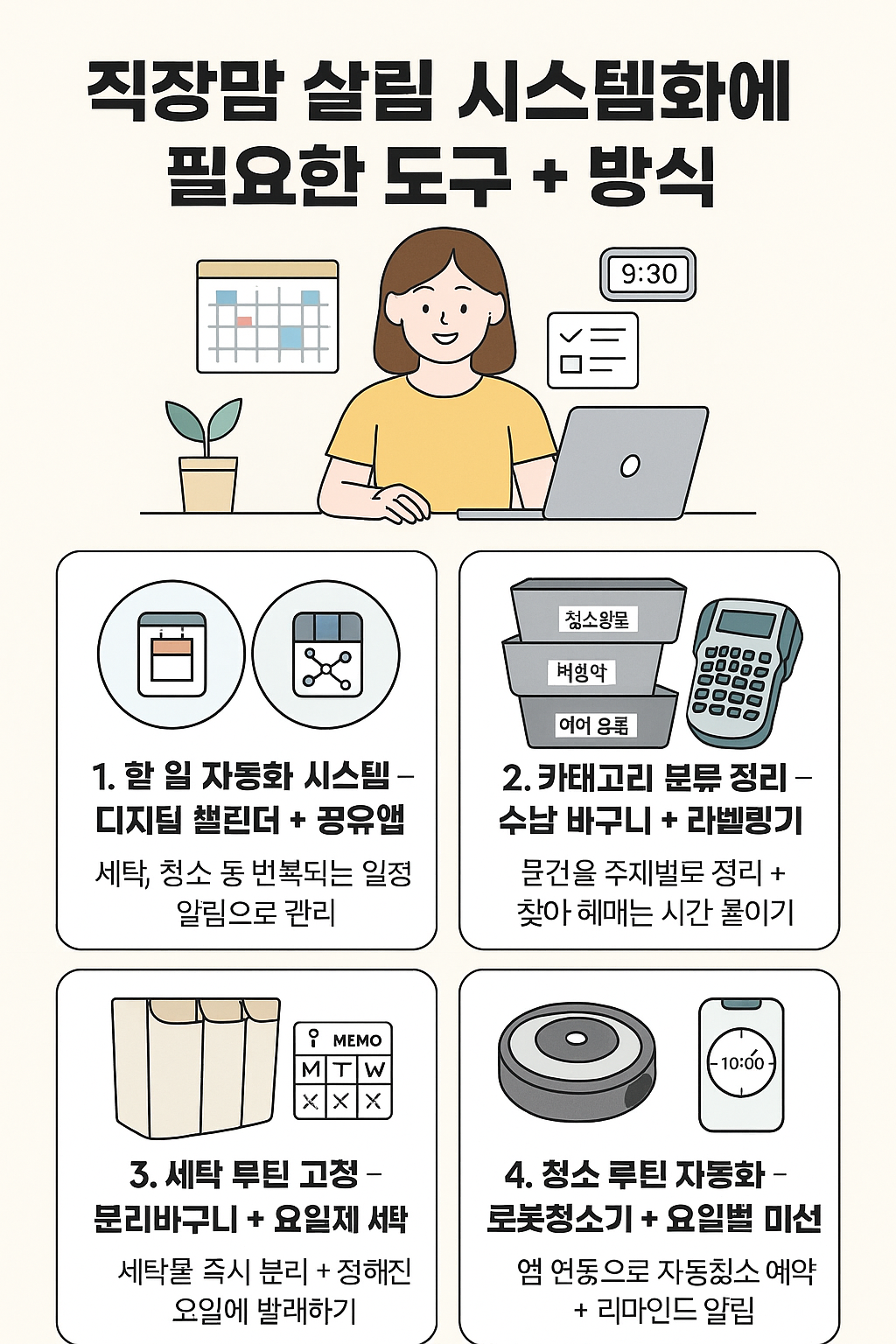 살림을 단순히 '해야 하는 일'이 아닌 '관리 가능한 루틴'으로 전환하려면 도구와 방식을 함께 갖춘 시스템화가 중요합니다. 아래는 직장맘이 실생활에 바로 적용할 수 있는 살림 시스템화 전략입니다.